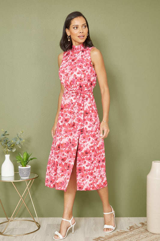 Yumi Pink Blossom Print Halter Neck Midi Dress With Split Hem