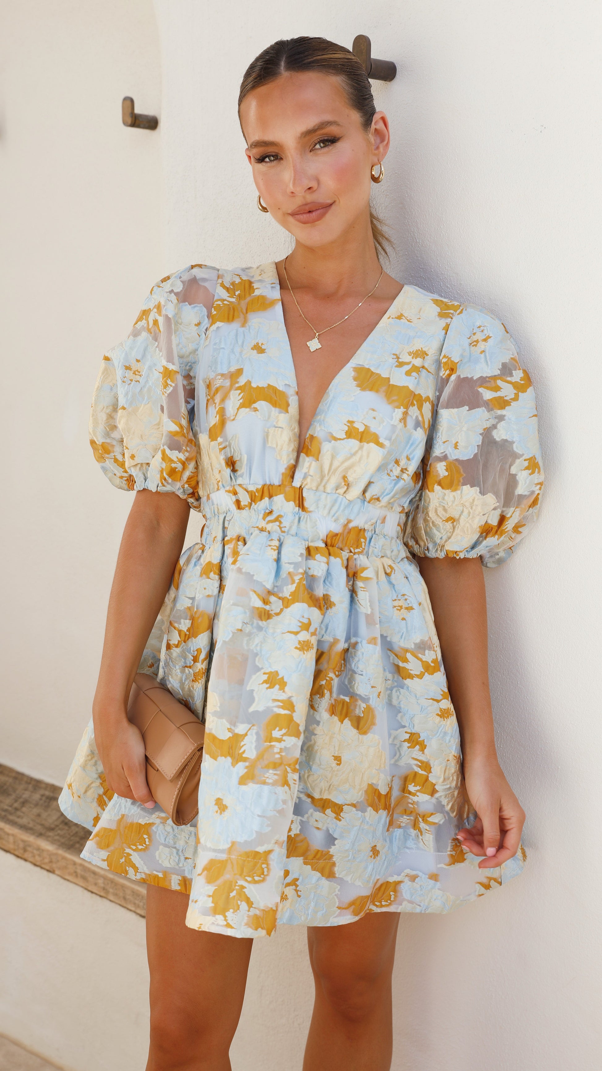 This mini dress features a semi-sheer jacquard fabric and a V-neckline, complemented by short balloon sleeves. It includes an invisible zipper at the back, a wide elastic waistband for a flattering fit, and a skirt with a structured hem. Fully lined for comfort and elegance.