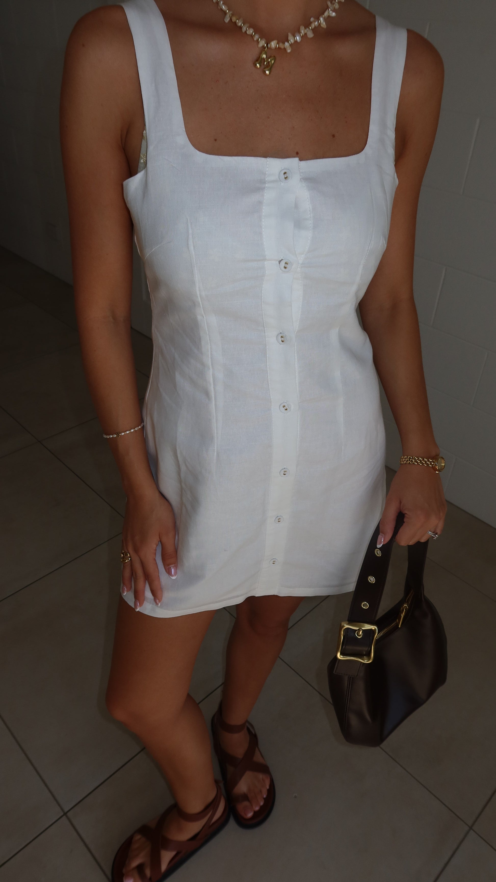 This off-white mini dress features a flattering square neckline and a sleeveless cut, perfect for warm days. It is detailed with fabric-covered buttons down the front and lined with soft cotton for comfort. Crafted from a blend of 80% ramie and 20% cotton, it offers a breathable and stylish choice for your wardrobe.