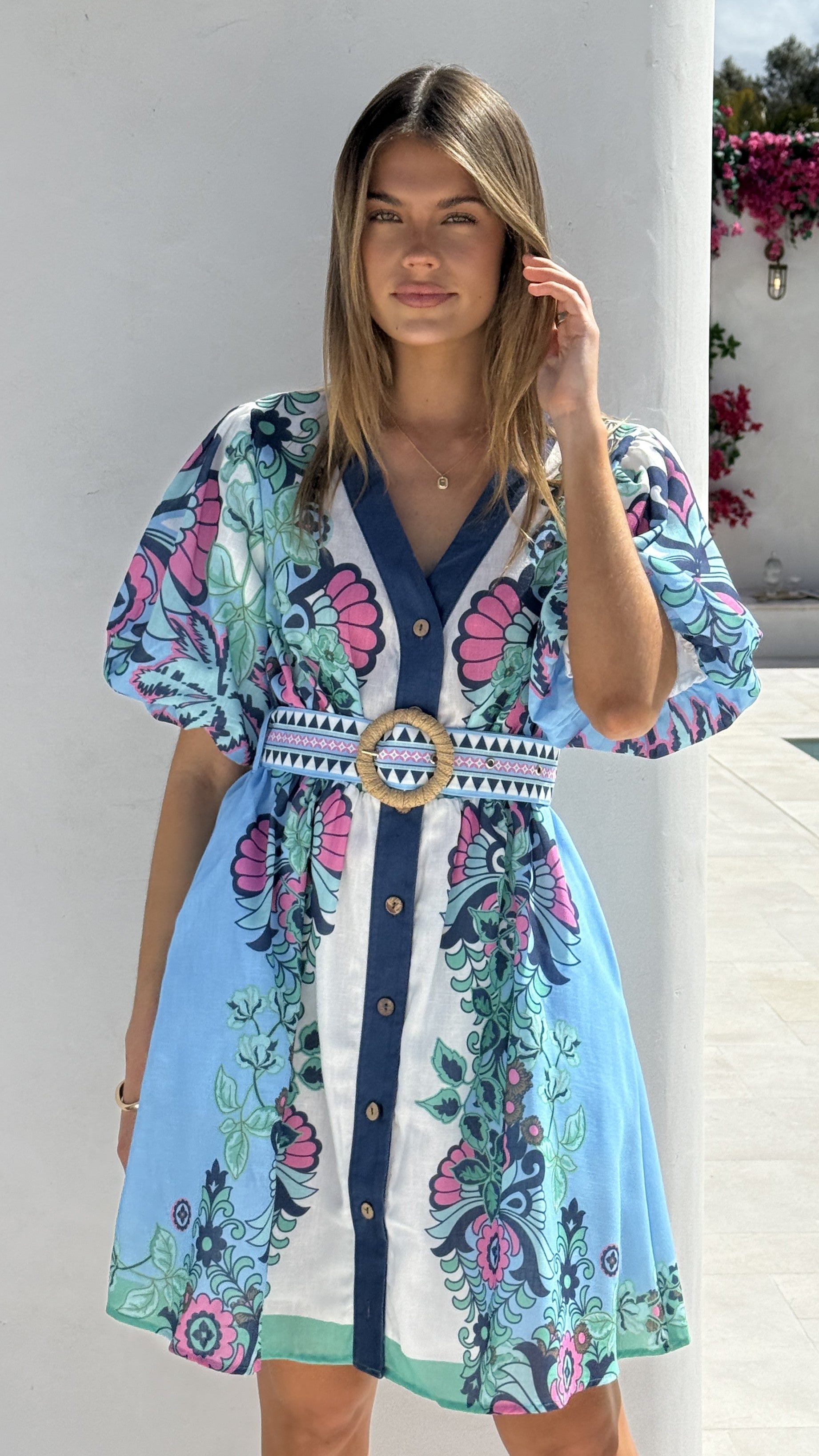 The Dali Mini Dress in Island Bloom Blue showcases a chic mini length silhouette, complete with a detachable belt and a V-neckline. It features a practical button-up front, an elasticated waist for ease, and softly puffed sleeves with elastic accents. The dress is partially lined for added comfort.