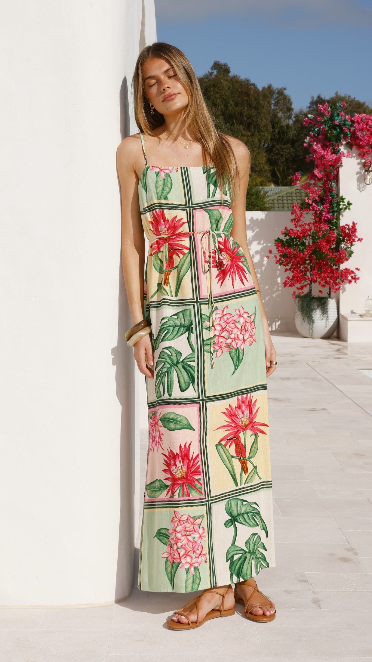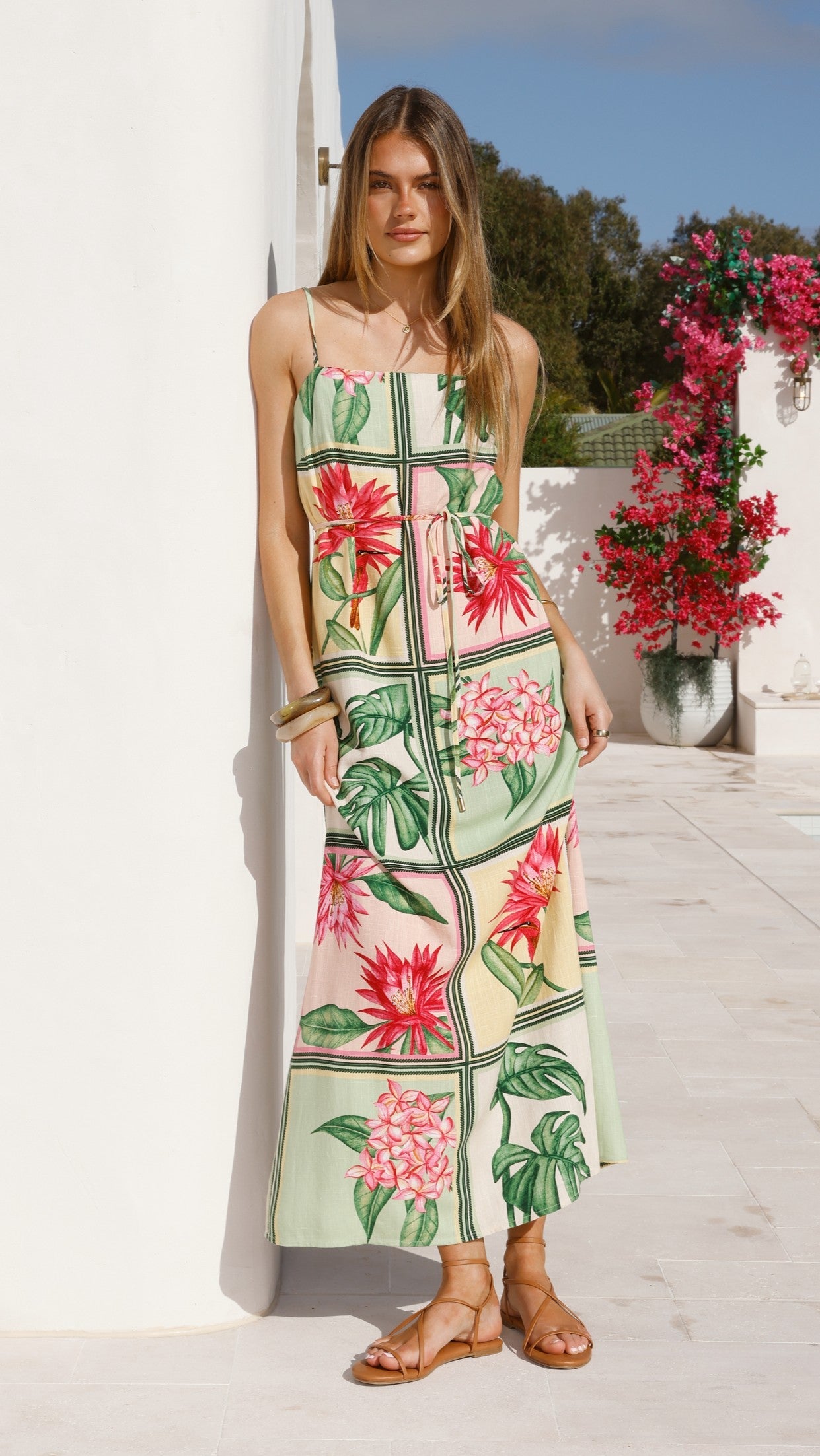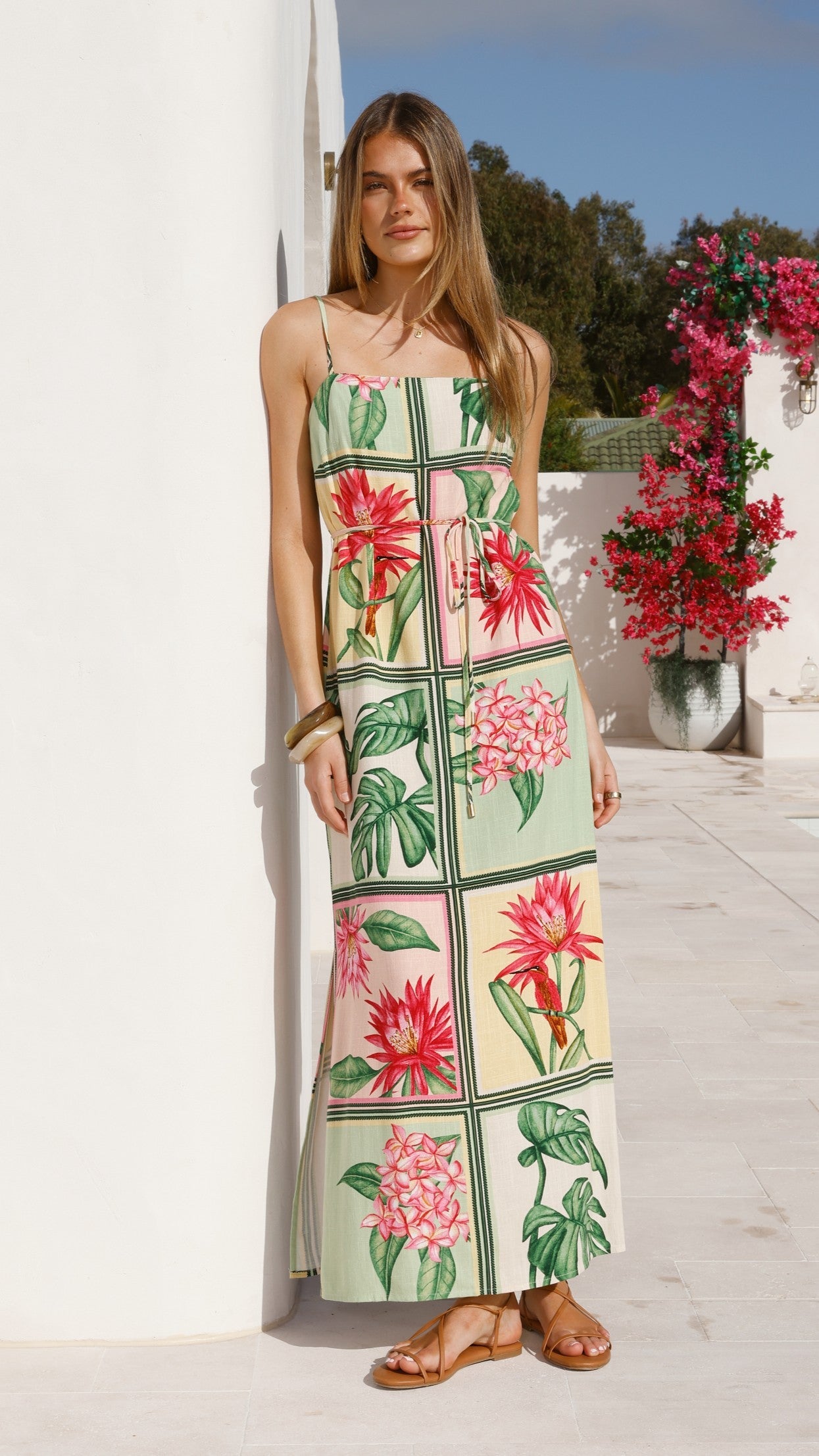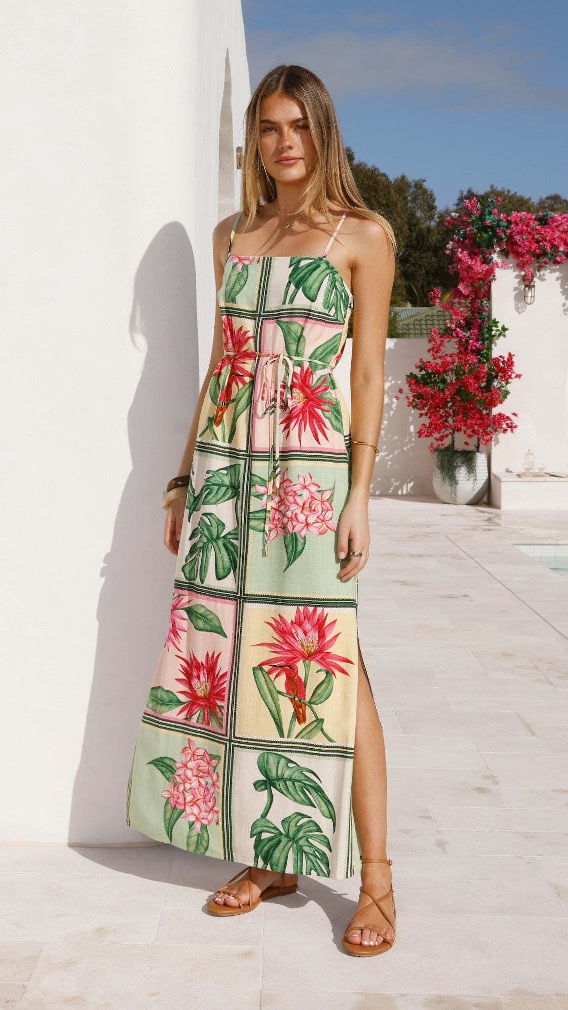 This maxi dress showcases a floor-length silhouette with delicate adjustable straps and a removable waist tie for a tailored fit. It features side slits for effortless movement, an invisible side zipper for a smooth finish, and is crafted from a breathable blend of 70% rayon and 30% linen. The design is unlined, enhancing its lightweight elegance.