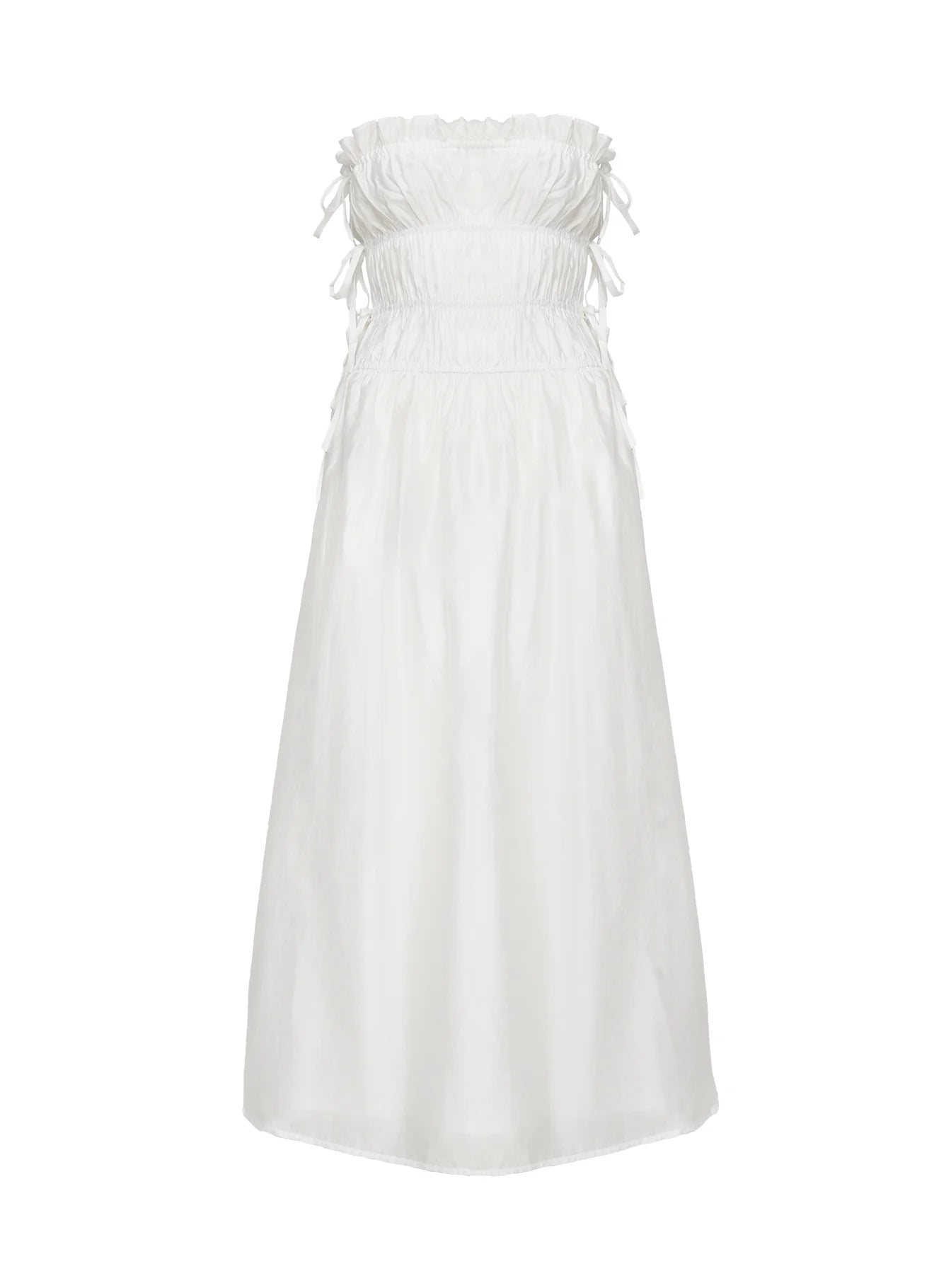 - Drawstring tie fastening at bust. ruching detail throughout bodice