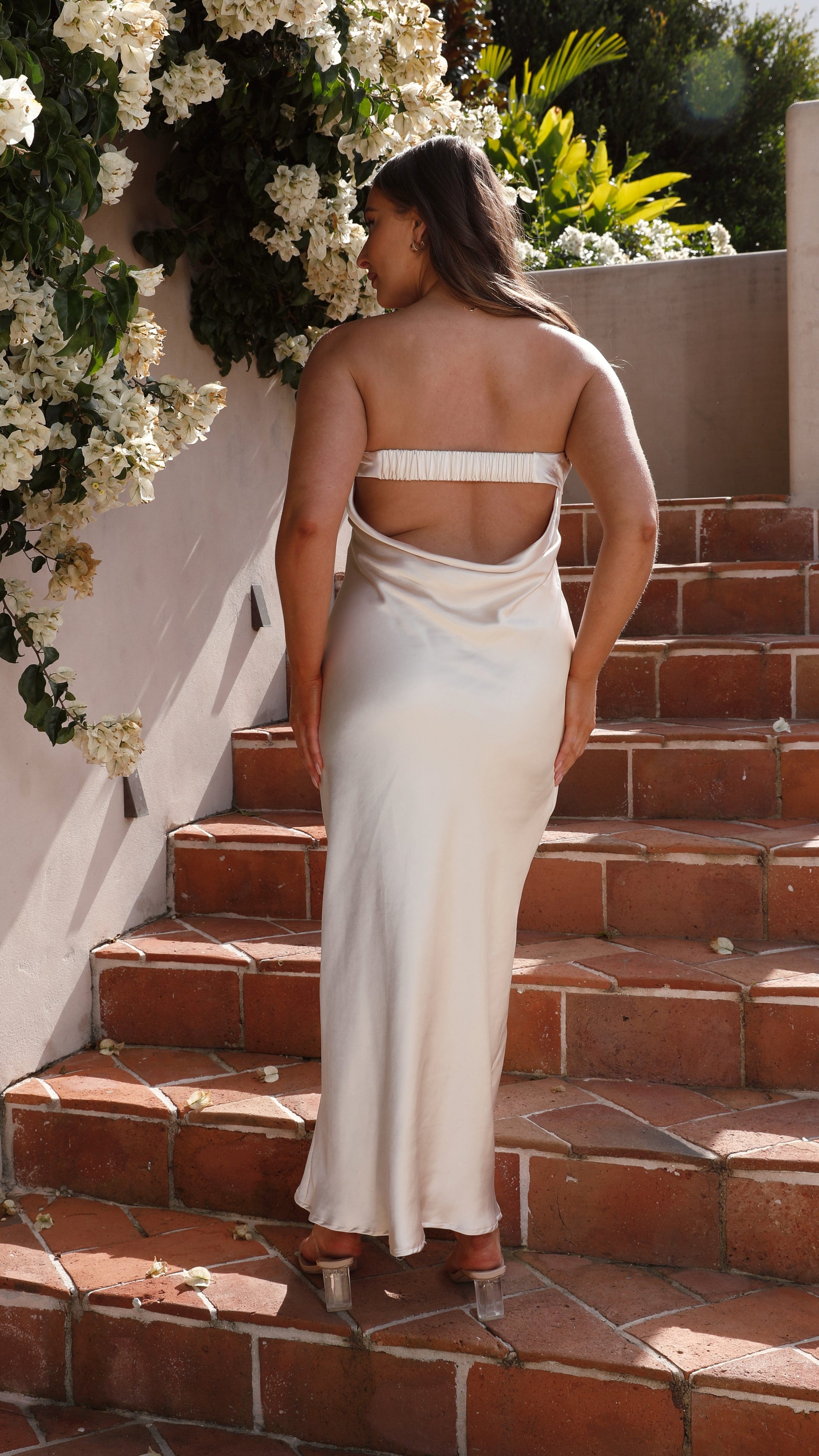 Embrace classic style with the Gisele Maxi Dress in Champagne. Boasting a maxi length and a strapless neckline, this dress features a unique cow back detail and an elasticated design for a comfortable and chic fit. Perfect for any formal occasion, this dress will make you feel elegant and stylish.