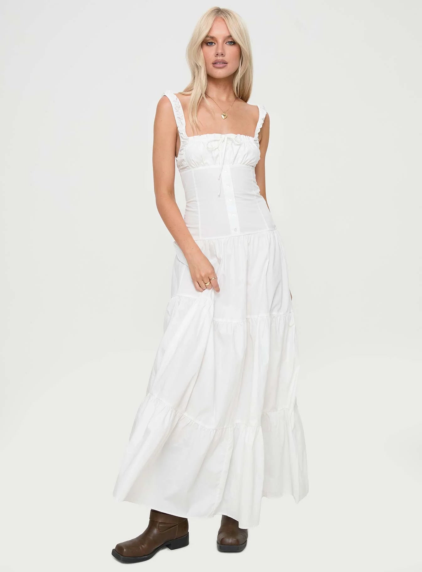 - Elasticated shoulder straps. square neckline. invisible zip fastening at side. faux button down front. tiered skirt