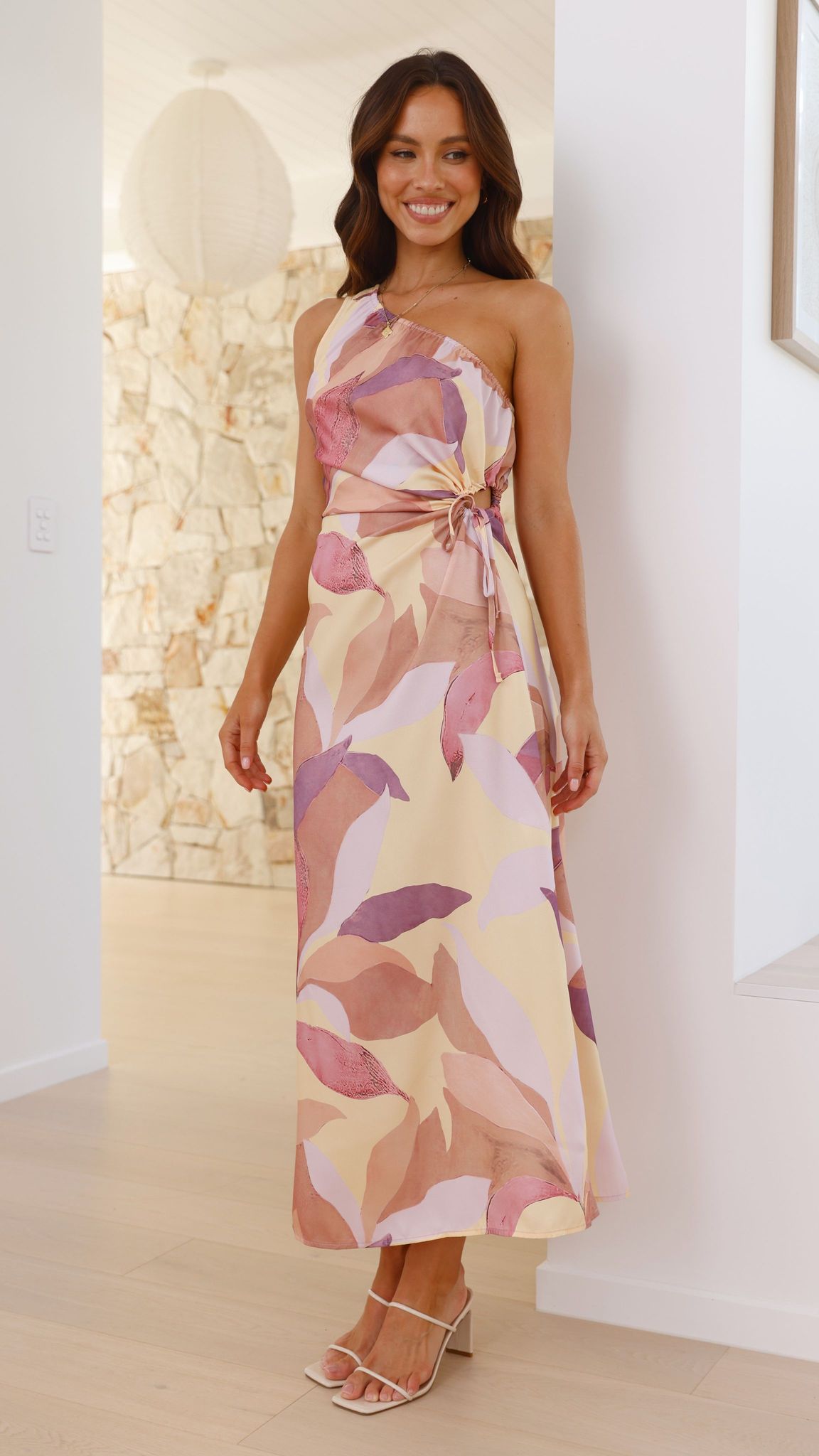 This maxi dress showcases a one-shoulder silhouette with an elasticated neckline and an invisible side zipper. It features a side cutout with an adjustable drawstring tie and a side leg split, all crafted without lining for a lightweight, elegant look.