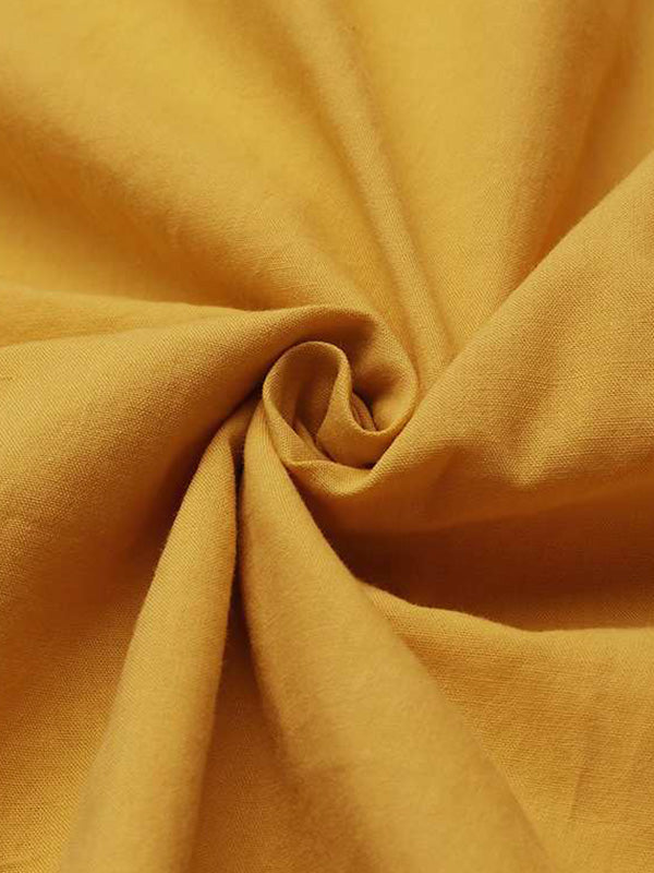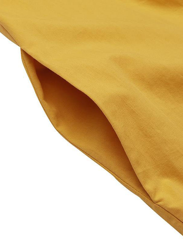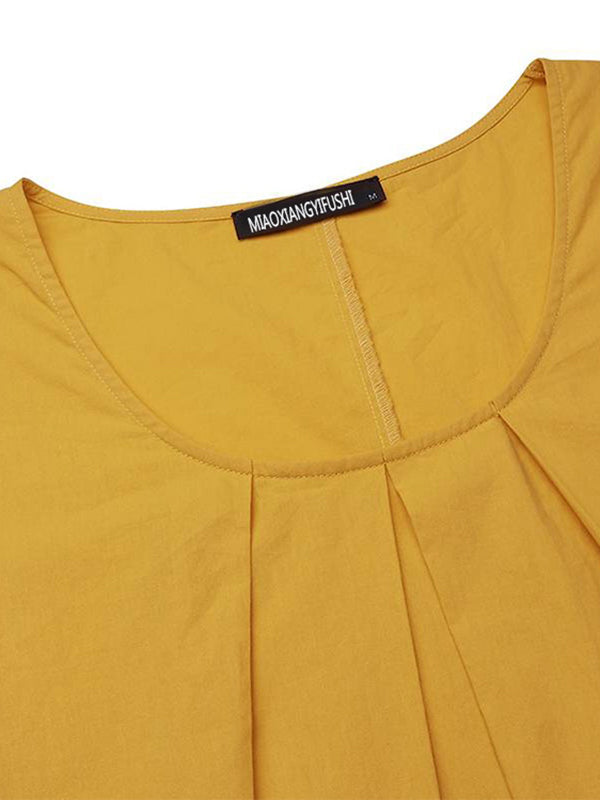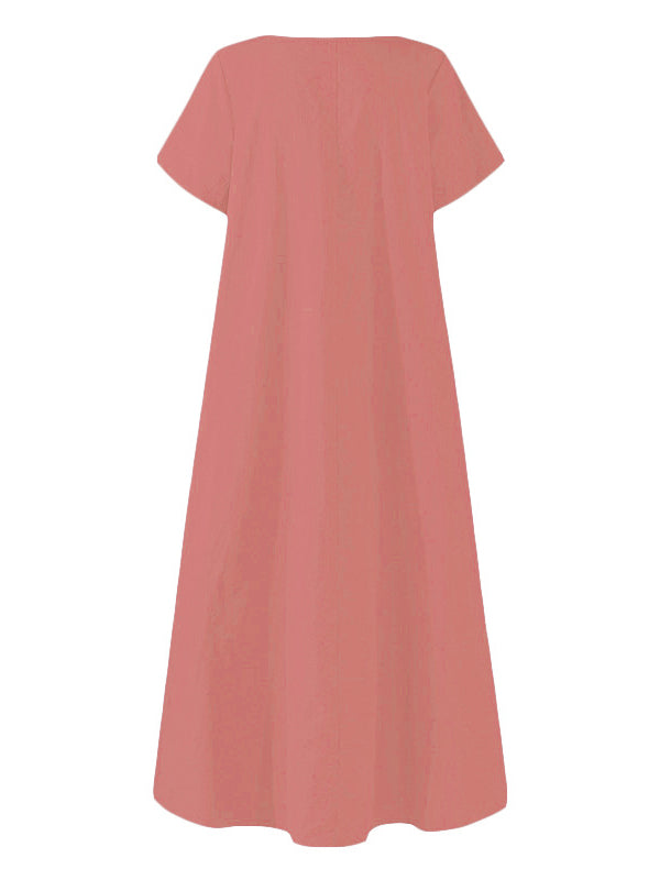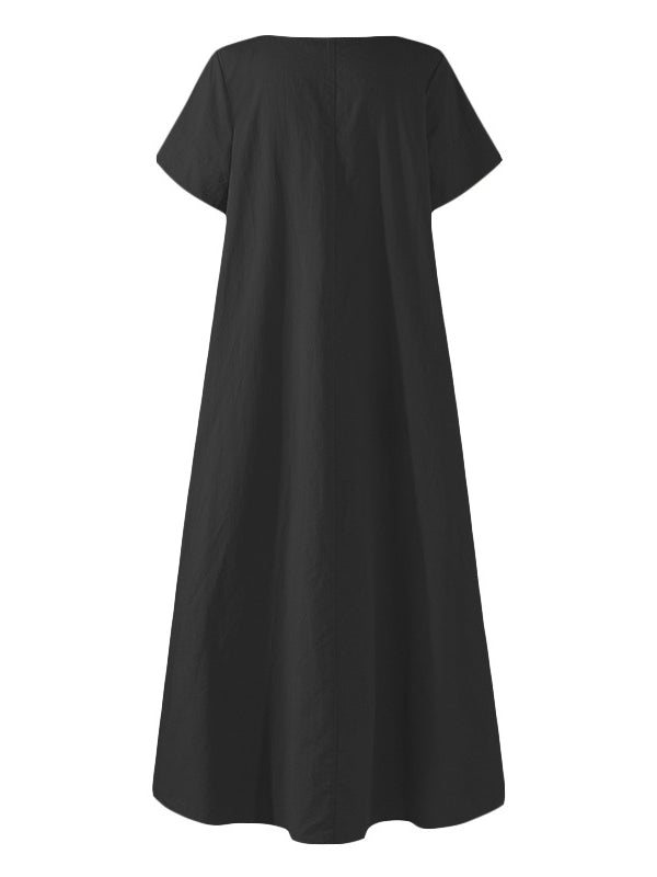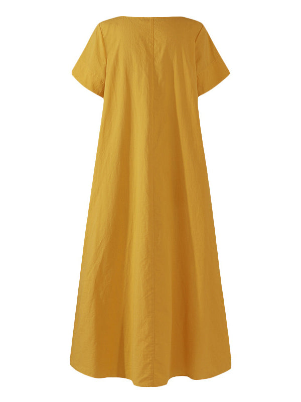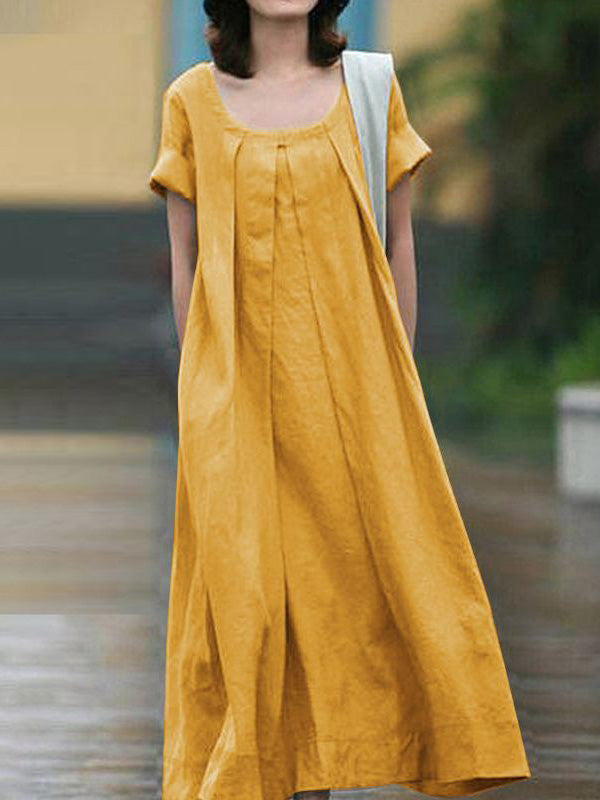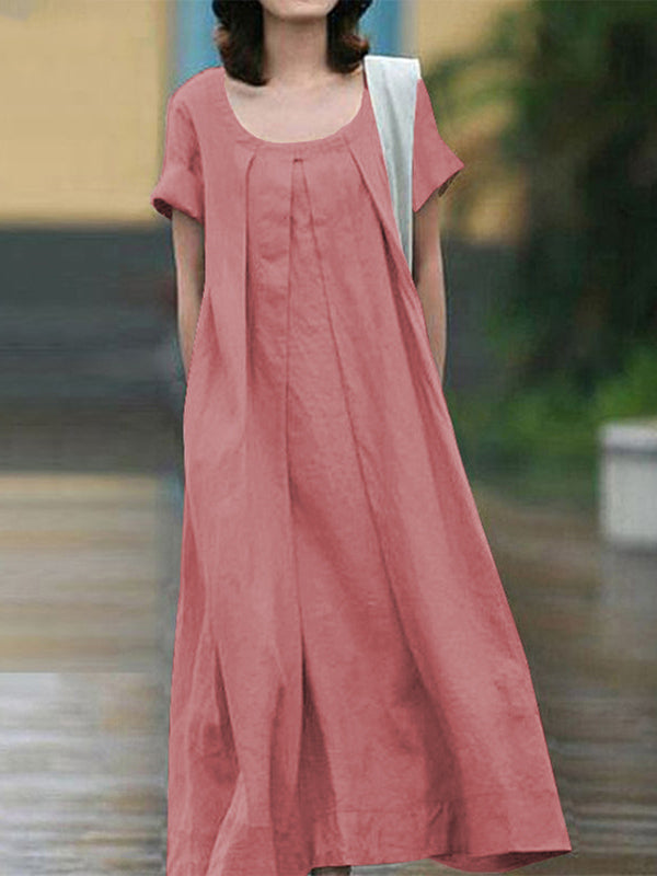 Simple Solid Color U-Neck Pleated Short Sleeves Maxi Dress