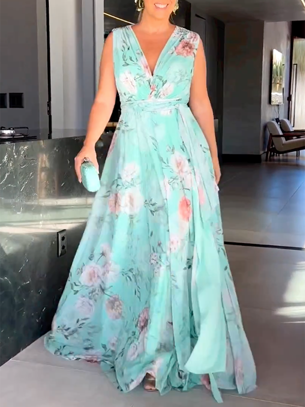 Sleeveless Floral Printed Split-Side V-Neck Maxi Dresses