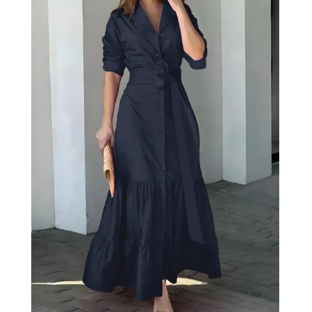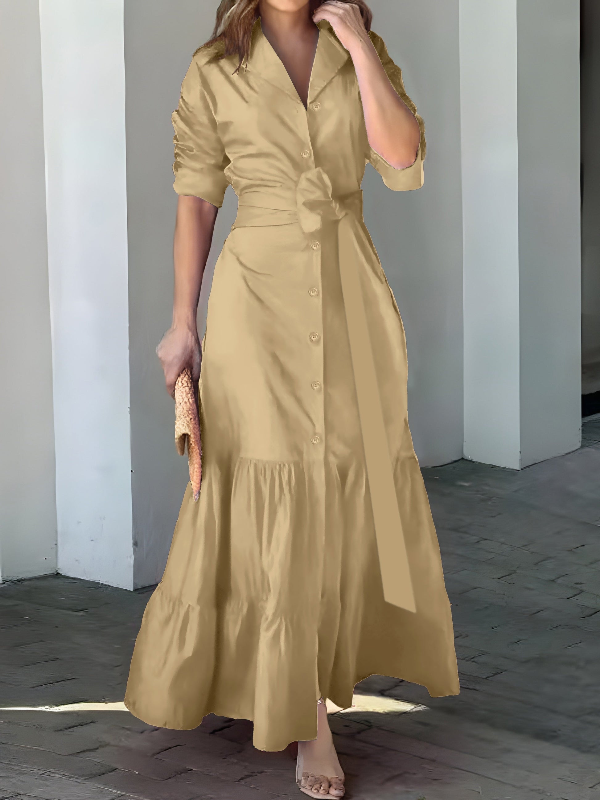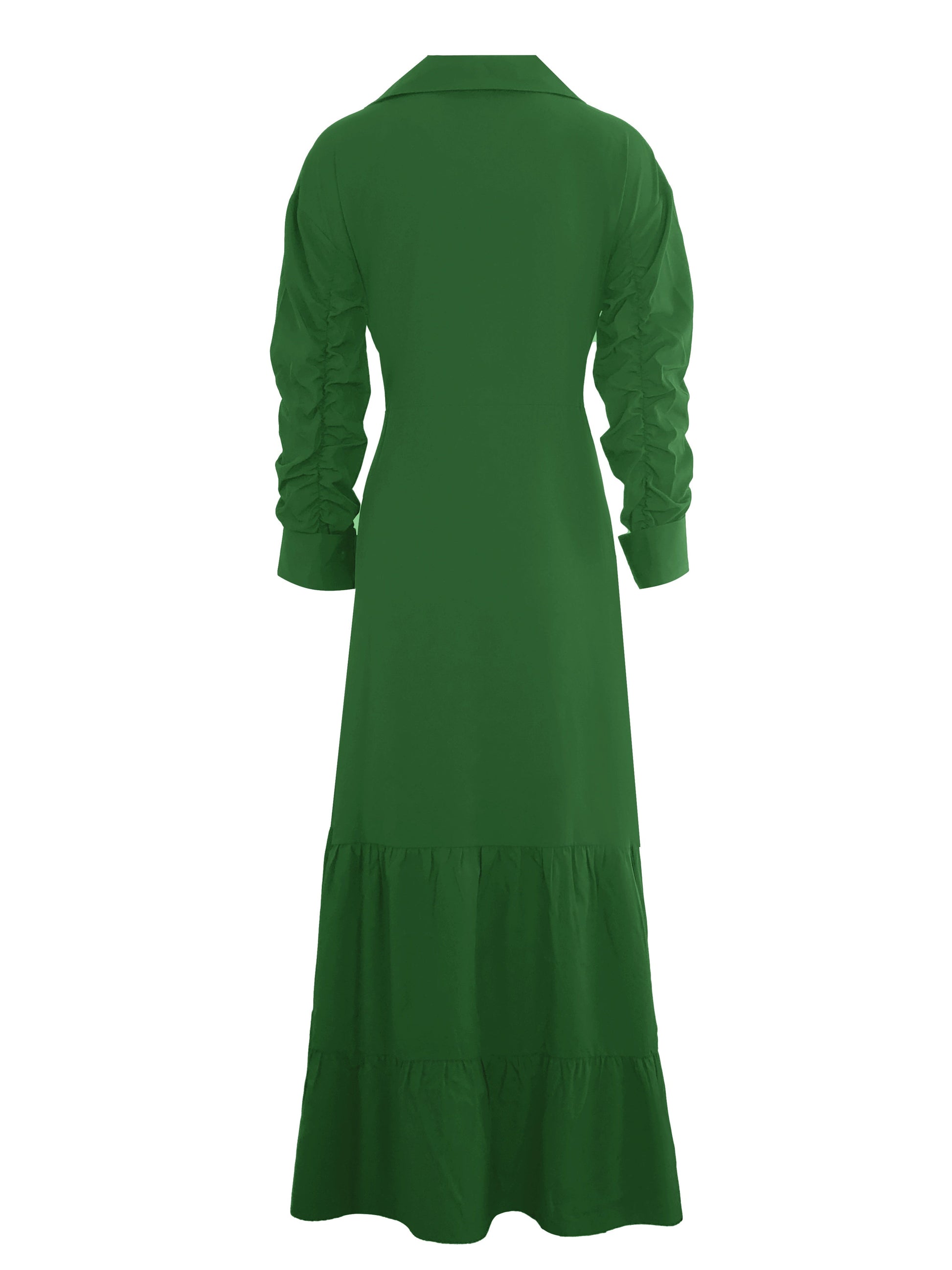 Solid Button Front Belted Dress. Elegant Ruched Sleeve Ruffle Trim Maxi Dress. Women's Clothing