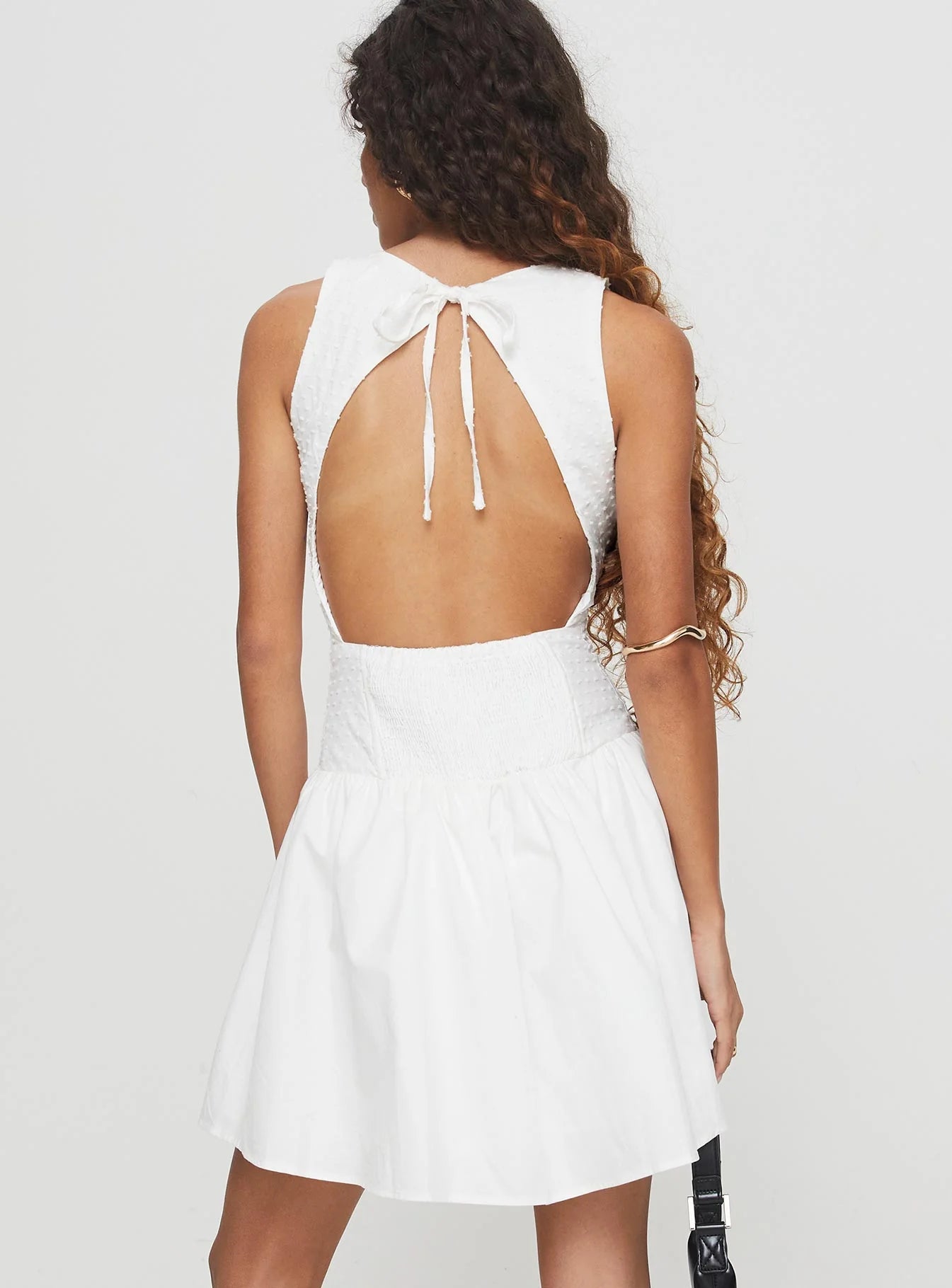 - High boat neckline. pleats at hem. open back with tie fastening. shirred band at back