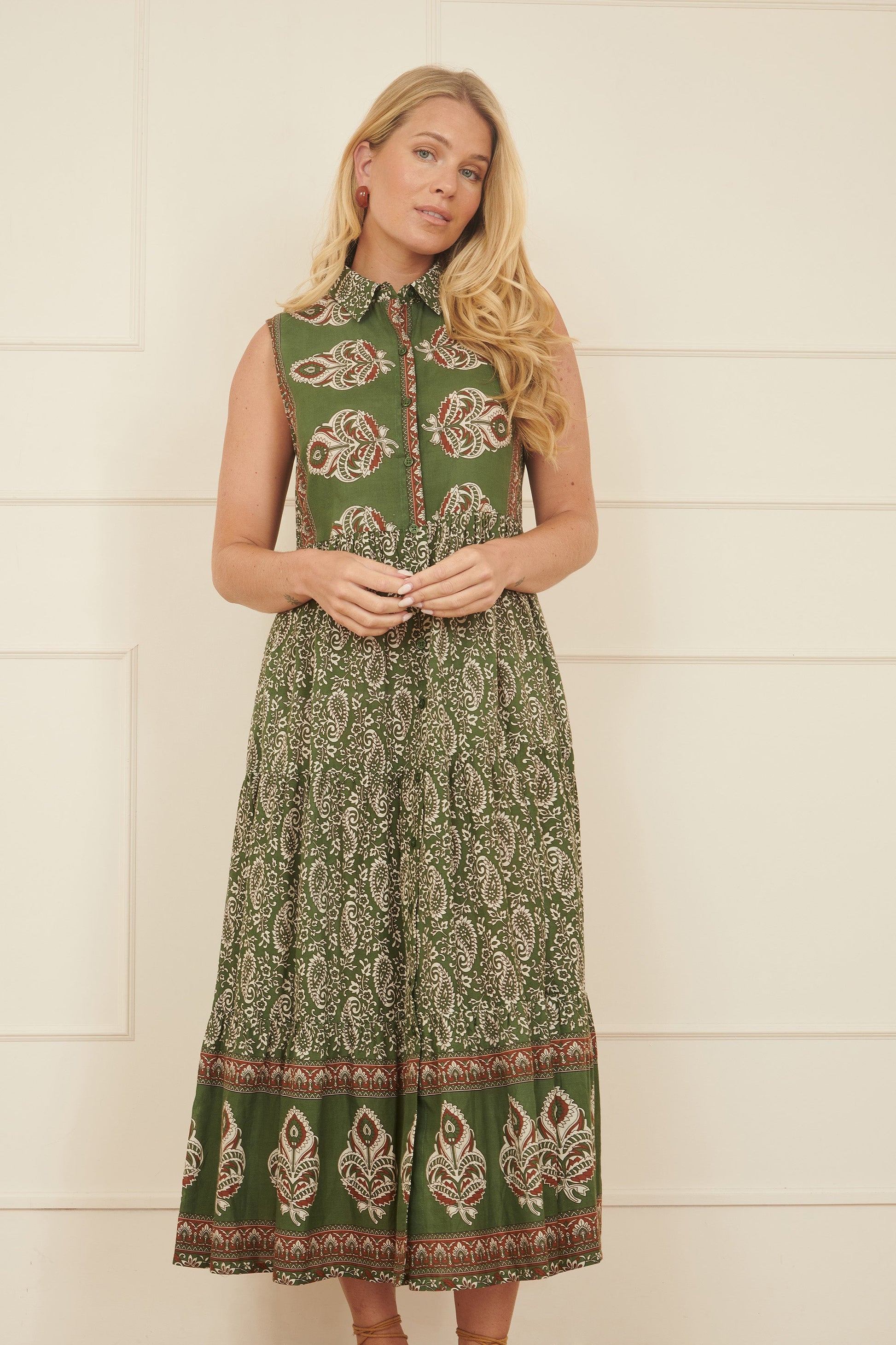 Yumi Green Cotton Paisley Midi Sleeveless Shirt Dress