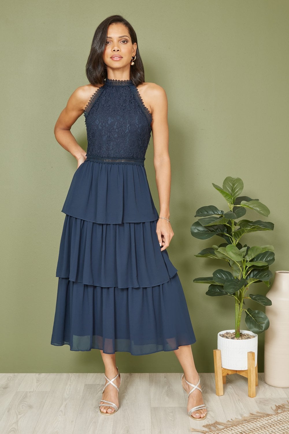 Yumi Navy Lace Halter Neck Midi Dress With Tiered Hem